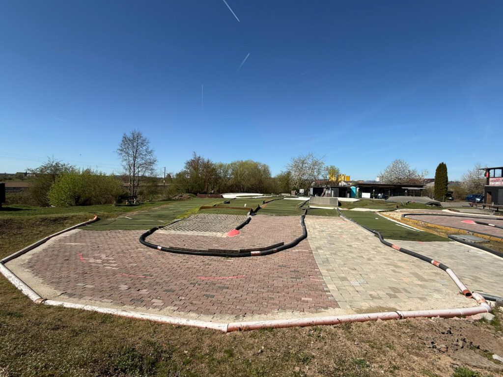 Streckenbelag: Schweißbahn, Kunstrasen, Pflaster und Beton.