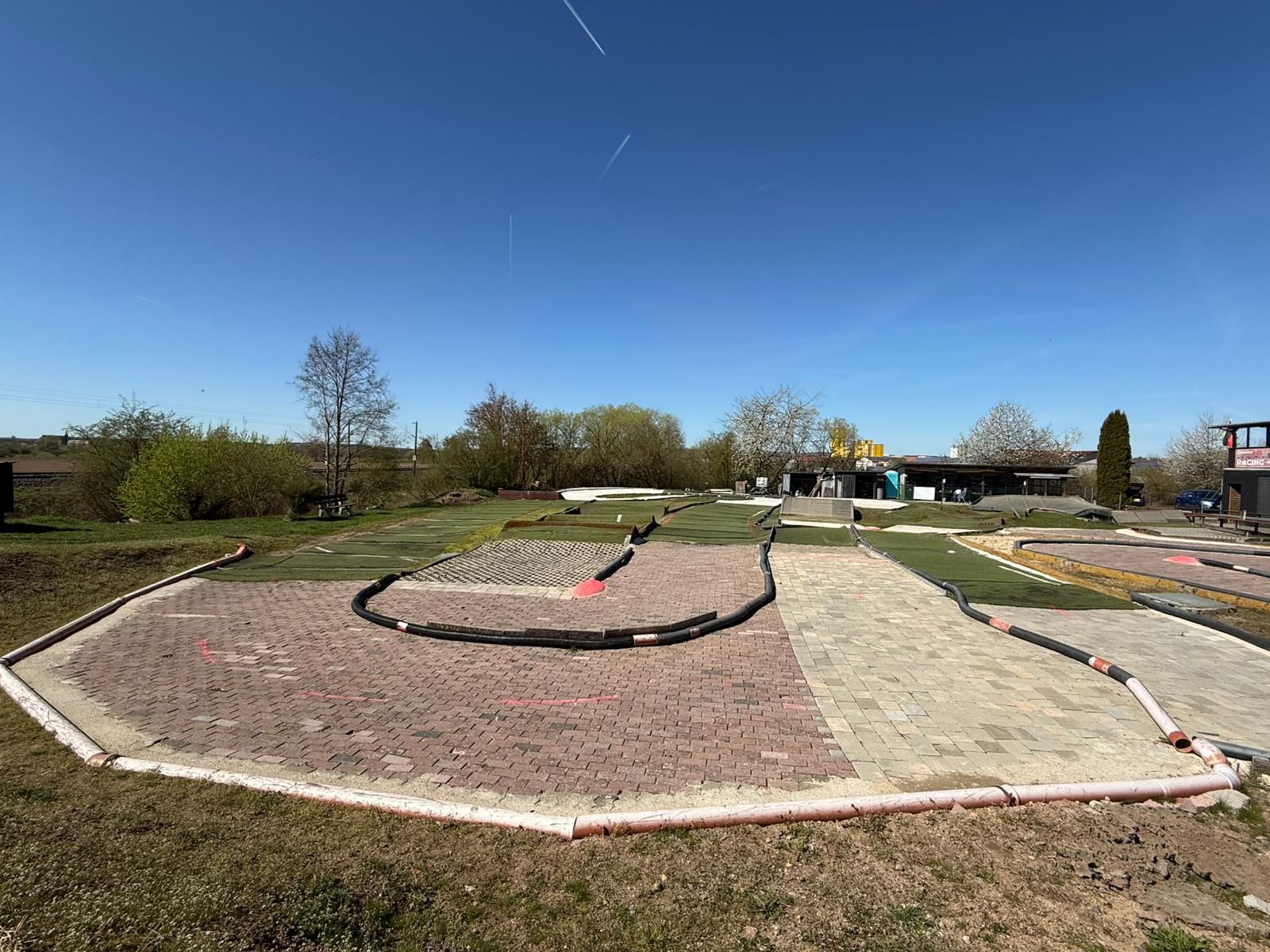 Streckenbelag: Schweißbahn, Kunstrasen, Pflaster und Beton.